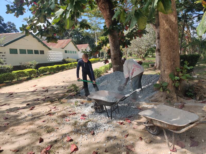 Net zoals de laatste paar dagen hadden we weer afgesproken met de matatu jongens voor het vervoer naar APDK. Op de kliniek werd het werk weer hervat. De platformen voor de zonneboilers werden met cement afgemaakt. Thomas, Allard en Martijn hielpen heel even mee om de steentjes en cementzakken naar de juiste plaats te brengen. Het cement werd door de de bouwploeg samen gemengd, daar kwam geen cementmolen aan te pas.